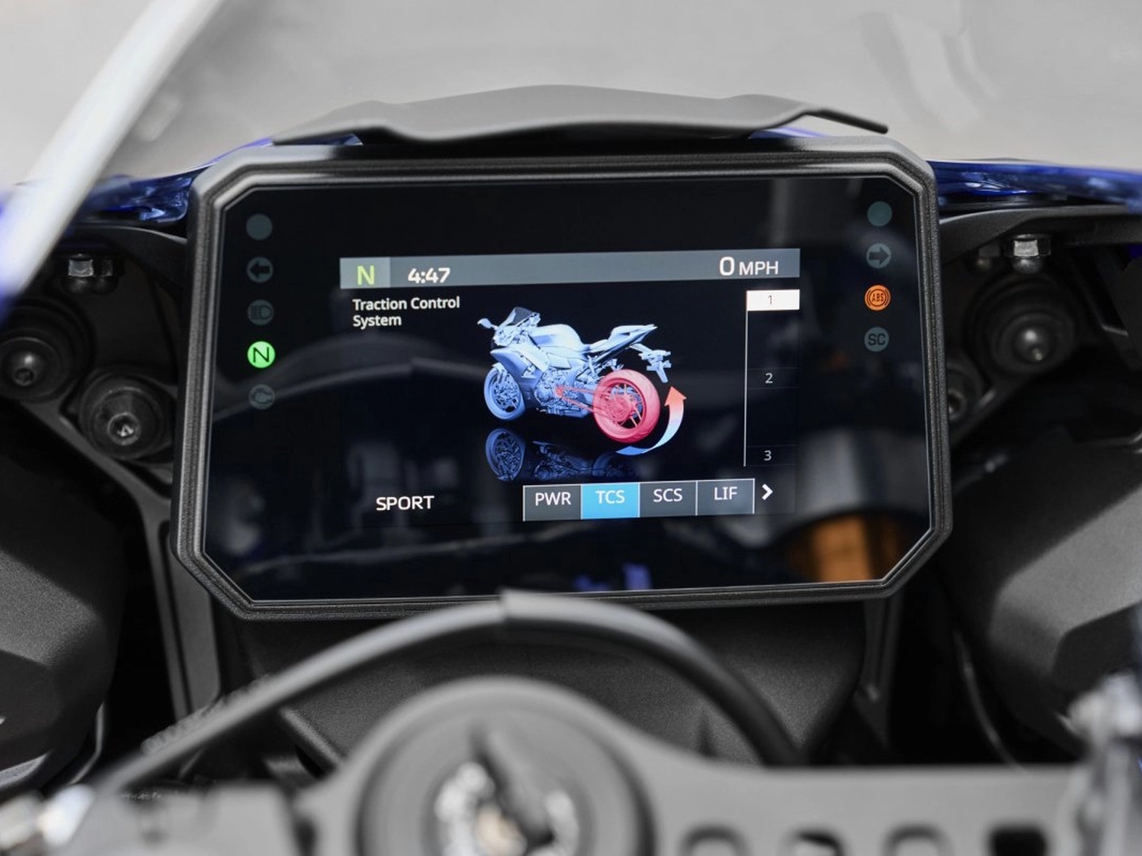 - The YZF-R7 now features an advanced six-axis Inertial Measurement Unit (IMU) developed from the YZF-R1 Superbike. Data collected from the IMU and wheel speed sensors enable a high-tech suite of rider aids including a Traction Control System (TCS), Slide Control System (SCS), front wheel Lift Control System (LIF), Brake Control (BC), Engine Brake Management (EBM) and Launch Control (LC). Each of these systems can have their levels of intervention adjusted to preference.