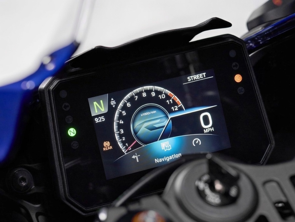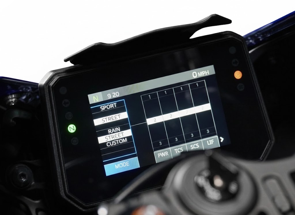 - A stunning new full-color five-inch TFT instrument display features four selectable themes along with a track-specific mode. Smartphone connectivity enabled through Yamaha's free Y-Connect app allows riders to receive message notifications, calls and listen to music (through use of an aftermarket Bluetooth® headset, not provided). Additionally, full turn-by-turn navigation is now available through the free Garmin® StreetCross app.